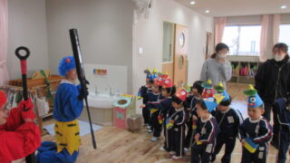 未分類 豆まき R8.2.3(火) 節分に豆まきをしました。年児に合わせて可愛いお面をかぶって参加しました。当日は、お父さん鬼に豆まきをしました。いちご組いちご組年少合同年少組合同ばら組ばら組すみれ組すみれ組ふじ組ふじ組ゆり組ゆり組鬼役を引き受けて頂いた、ふとっぱら会の皆様あ... 2026.03.03 未分類