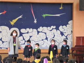 第二保育期を無事に終え、お誕生会やみかん狩りなど行事を振り返りました。また、新しく入ってくれた園児の紹介。 そして、第三保育期に向けての、園長先生から「いっしょうけんめい あそぶ」「あきらめない」「きもちよい あいさつ」を目標にがんばりましょうとお話を頂きました。