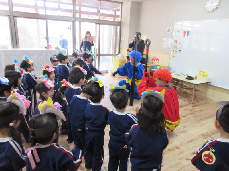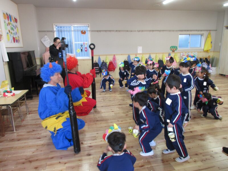 節分に豆まきを行いました。年児に合わせて可愛いお面を被って参加しました。
